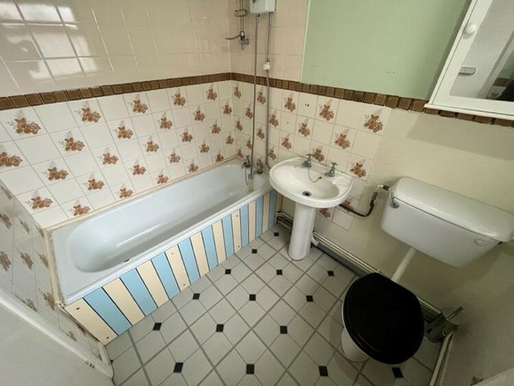 With low flush w.c. wash hand basin and panel bath with electric shower over. Radiator and window to side aspect.