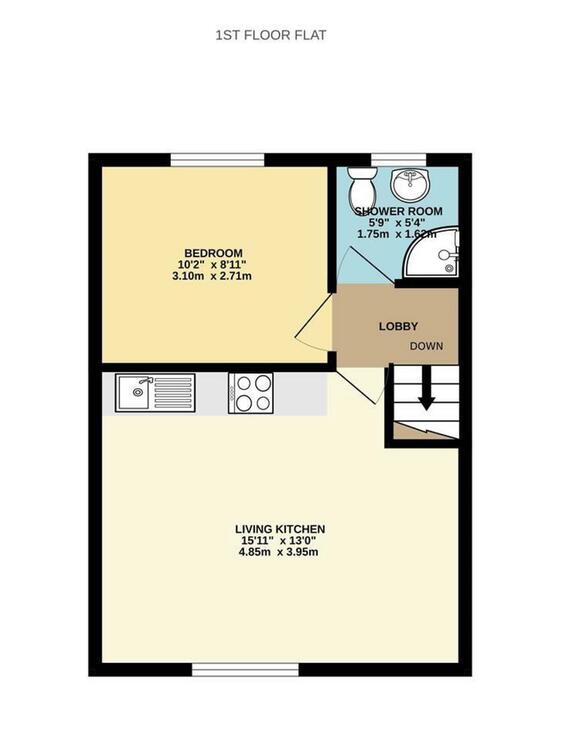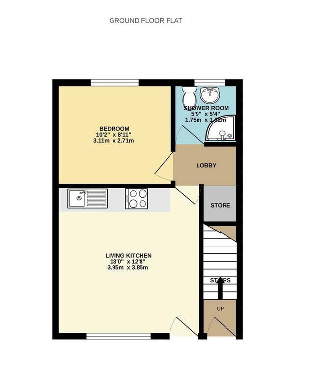 The first floor maisonette offers approximately 35 square metres of internal space and access from its own front entrance door to staircase leading to a first-floor lobby where doors lead to the living/kitchen, double bedroom and shower room/wc.