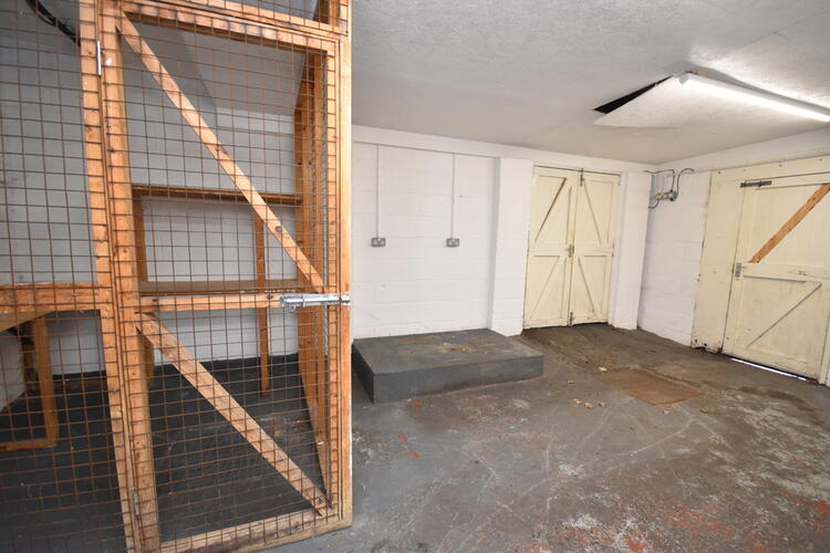 Fluorescent strip lighting, power, cold water tap, double opening wooden doors and single door to outside. Double opening barrel hatch to the cellar, and steps with connecting door to the inner hall.
