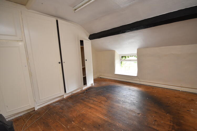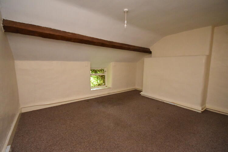 Feature exposed stonework and arched single glazed window, double radiator with thermostat, beamed ceiling, and exposed wooden floorboards. Door to hall.