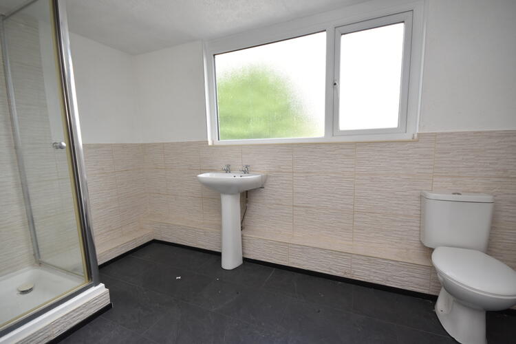 White suite comprising: tiled shower enclosure with Triton electric shower, glazed shower screen and glazed door, pedestal wash hand basin and low level dual-flush WC. Part-tiled walls, ceiling light point, UPVC double glazed window with obscured glass, and laminate slate effect flooring.