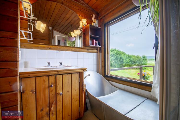 Bathroom With a four piece suite comprising wash hand basin inset to vanity unit, free standing tin style bath with mixer tap, WC, shower cubicle with electric shower over, part tiled walls, wall mounted heated towel rail, storage cupboard and double glazed window with secondary glazing.