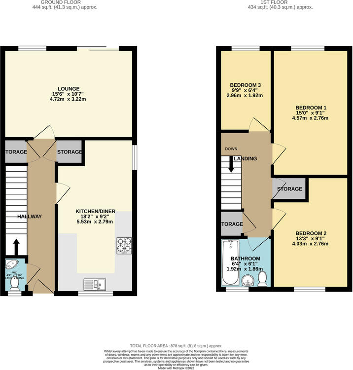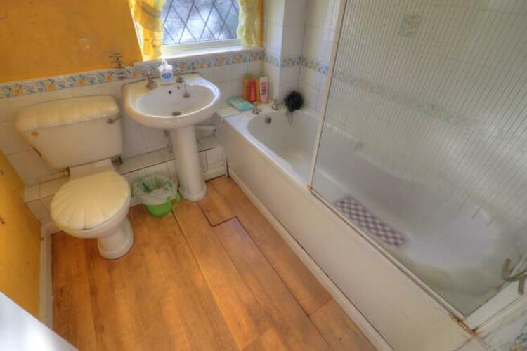 With three piece suite comprising panel bath with shower over, WC, wash basin and double glazed obscure window to the front elevation.