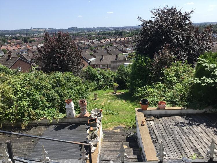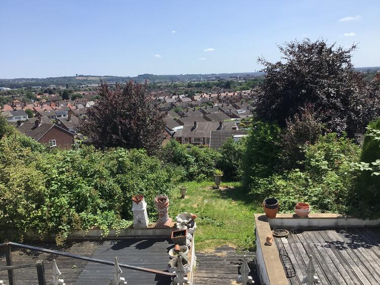 A rear garden with decking, lawn and views. To the front is a driveway, lawn and shrubbery.