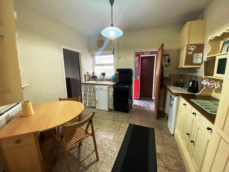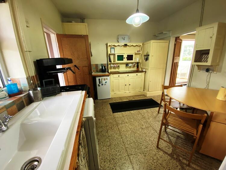 Having a range of free standing cupboards and dresser with ceramic Rangemaster sink drainer with mixer taps and tiled work surface with base cupboard. There is a gas cooker, plumbing for a dishwasher and space for a fridge. There is a free standing larder cupboard, wall mounted plate rack and a matching wall mounted cupboard, which houses the combi boiler (serving the domestic hot water and central heating system), Terrazza tiled flooring, radiator, original panelled doors and access to the roof void.