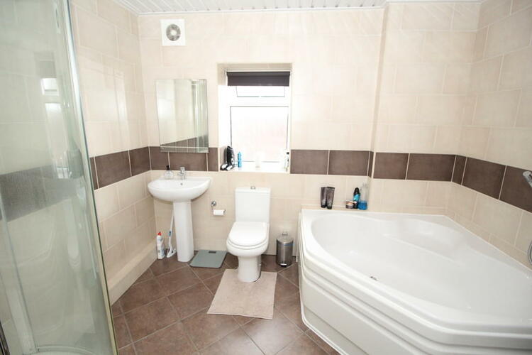 9ft 6 x 7ft 6 (2.9m x 2.29m) Having a modern four-piece suite that comprises of a corner bath with shower attachment, separate shower cubicle, pedestal wash basin and a low flush W.C. Inset lighting to ceiling and a towel radiator.