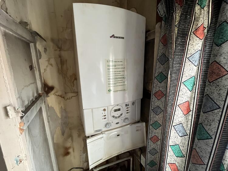 With cupboard with combi boiler, radiator and two windows to rear aspect.