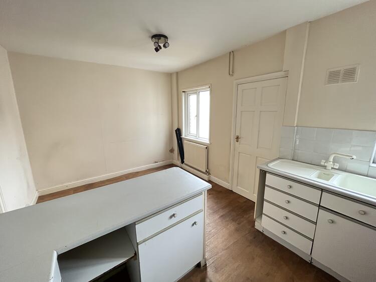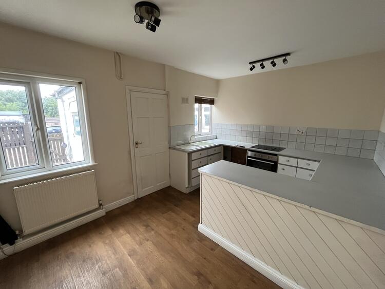 With a range of units, worktops, inset sink, integrated oven, hob and extractor, radiator and two windows to rear aspect.