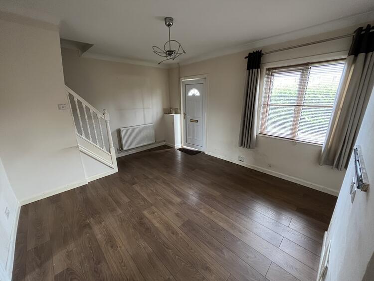 With radiator, laminate flooring, stairs to first floor and window to front.