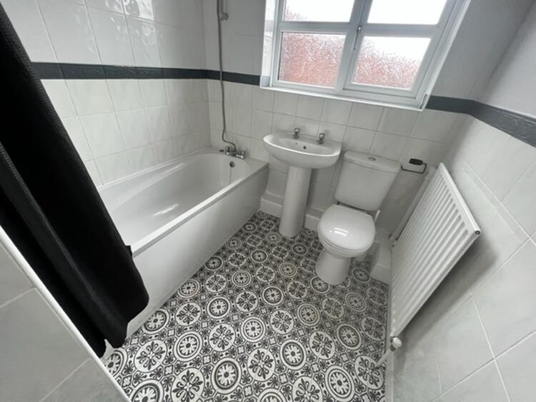With white suite comprising of panel bath and shower attachment over, wash basin, WC, radiator, part tiled walls, shaver point and uPVC double glazed window. Minimum depth measurement.