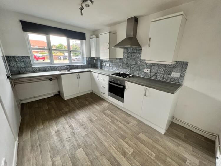 With fitted wall and base cupboards with white gloss finish, roll top work surfaces, integrated electric oven and gas hob, cooker extractor hood over, tiled splash backs, stainless steel sink and drainer, uPVC double glazed window, Ideal Logic gas-fired central heating boiler and plumbing for washing machine.