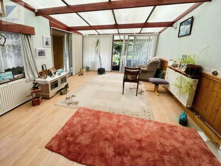 Having uPVC double glazed window to side, three aluminium framed patio door units, and central ceiling light and two radiators.