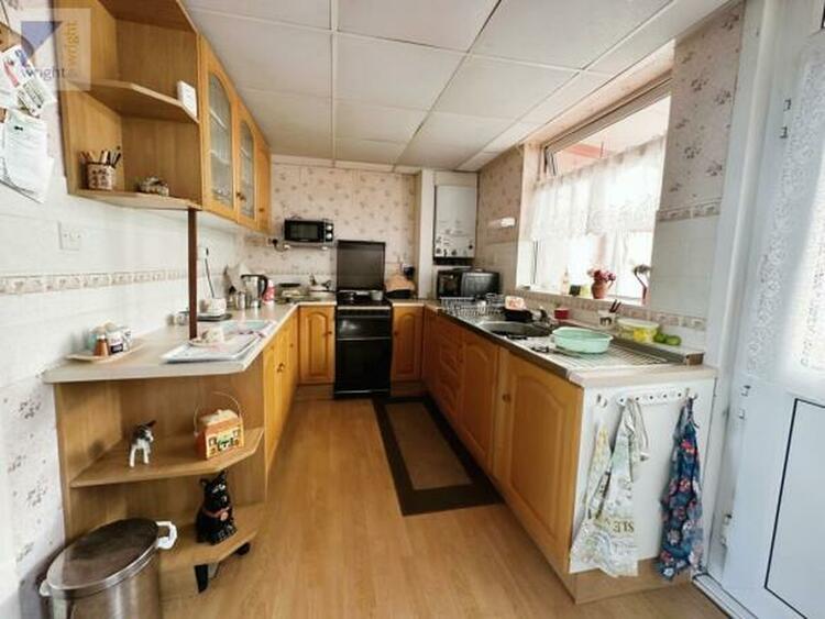 With uPVC double glazed window to rear aspect, range of matching wall and base units with work surfaces over, single bowl double drainer sink unit with mixer taps, combi boiler and door to rear lobby.