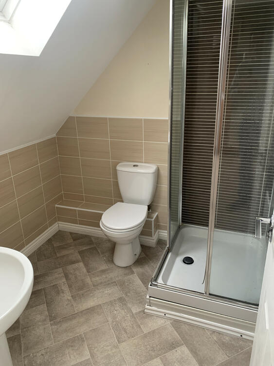 Having a modern white suite comprising of a low level WC, wash hand basin and a glazed shower enclosure with a thermostatically controlled shower unit. There is Porcelanosa tiling on all elevations forming a splash back to the suite, feature flooring, central heating radiator, a sloping ceiling with a Velux skylight to the rear elevation of the property, a ceiling mounted extractor fan and a ceiling light point.