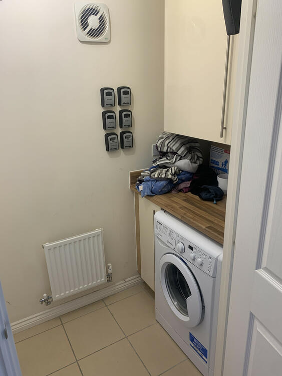 A useful utility room having base and wall mounted units, single appliance space below with plumbing, a tiled floor, central heating radiator, wall mounted extractor fan and a ceiling light point.