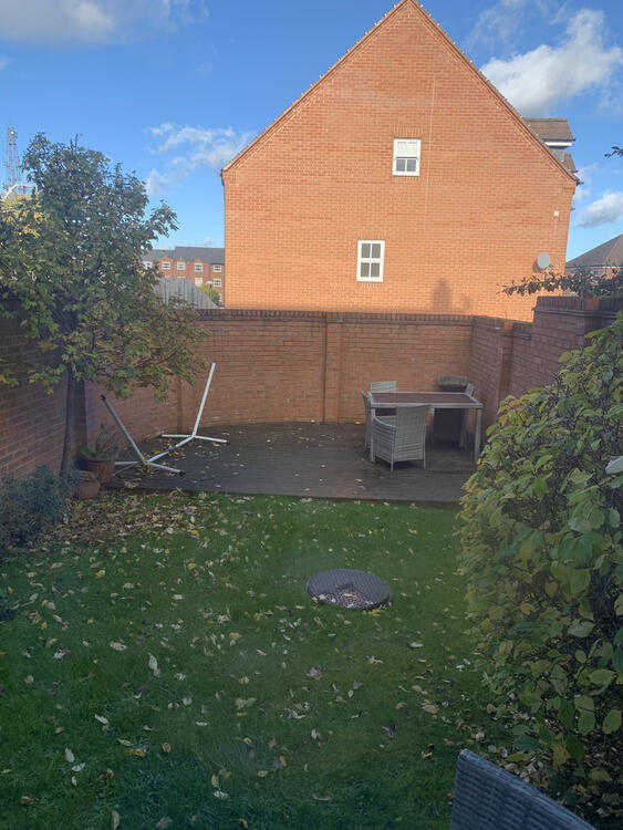 A pleasant, well maintained rear garden with a paved patio area, a shaped lawn with well stocked borders leading to a decked patio area. The garden is<br>well screened by a brick garden wall. We are advised that the area of land to the side of the rear garden also belongs to this property.