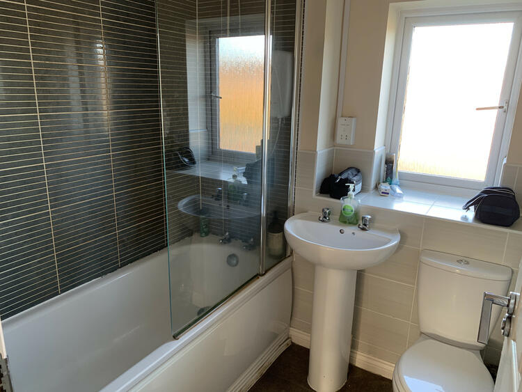 A modern bathroom having a white suite comprising of a panelled bath with electric shower unit over and glazed shower screen, pedestal wash hand basin and low level W.C. The room has tiled effect flooring and Porcelanosa tiling on all elevations forming a splash back to the bathroom suite. An opaque double glazed window with a deep matching tiled display sill overlooks the rear elevation of the property.