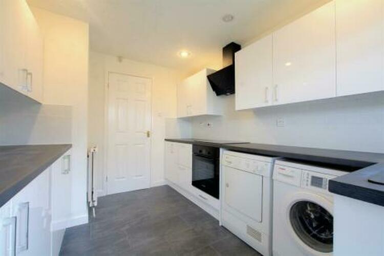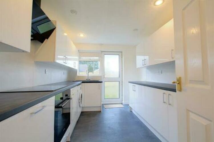 With a range of fitted wall and base units, work surfacing with tiled splashbacks, single sink and drainer with mixer tap, inset electric hob with air filter above, inset electric oven below, plumbing for a washing machine, further appliance space, radiator, uPVC double glazed window and door to the exterior.