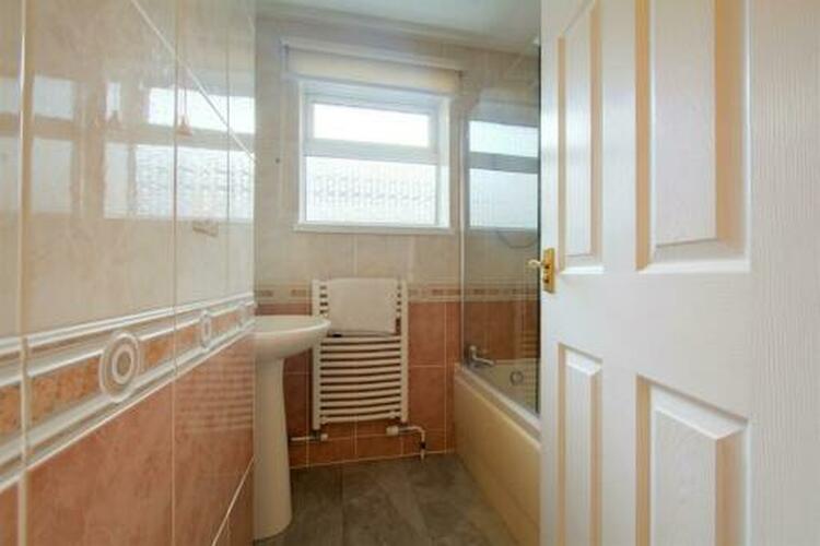 Pedestal wash hand basin, bath with Mira shower over, fully tiled walls, wall mounted heated towel rail, uPVC double glazed window, extractor fan.