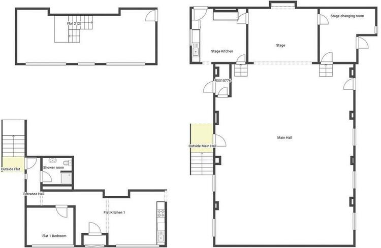 Main hall, steps up from hall to kitchen area, steps from hall up to further room, elevated stage area.