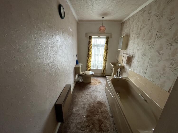 UPVc double glazed window, 3 piece suite comprising panelled bath, pedestal wash hand basin, low flush WC, wall mounted electric heater, built in cupboard with hot water cylinder