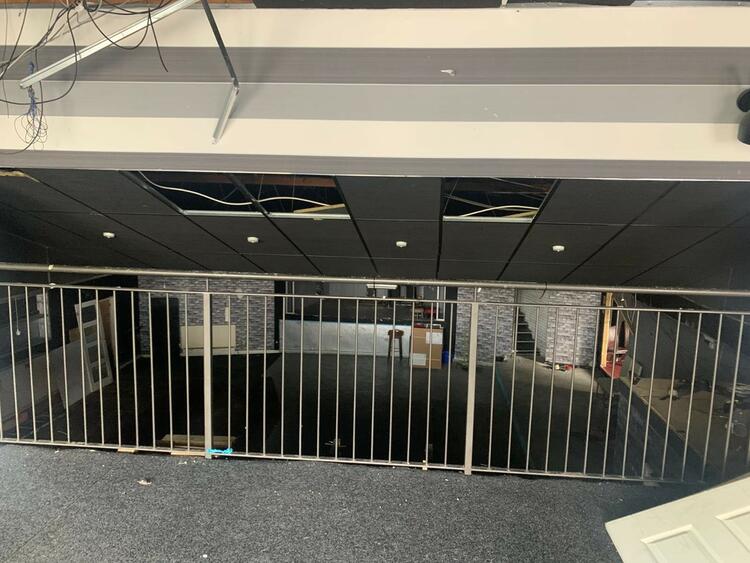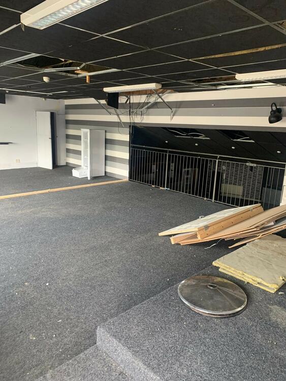 Suspended ceiling, two windows overlook the front of the property with a small bar and seating areas. Carpeted and vinyl flooring. DJ booth area under stairs. Stairs lead you up to the first floor, fire exit door into the cellar and double doors out into the hall and main bar area.