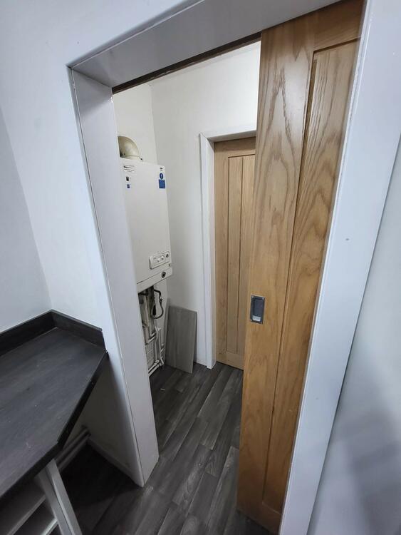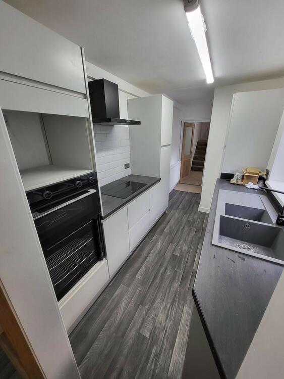 Fully refitted with a range of wall and base units, sink and drainer with mixer taps, hob and oven with extractor hood and window to side. <br>Rear lobby with central heating boiler.