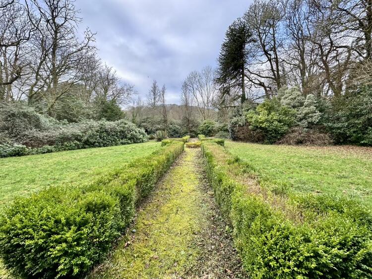 There are two approaches to the house, an old 1/4 mile carriage driveway adorned with Yew trees, Palms and wild rhododendrons, bamboo, copper beeches with a stream following the path into a brook. An original water system from a spring nearby supplies the Mansion House and land beyond. A priceless requirement nowadays which we have named “blue gold“.