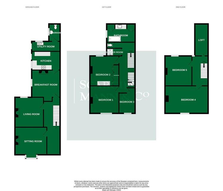 On the first floor are two double bedrooms, a single bedroom, a large bathroom, separate w.c. and a separate shower. On the second floor are two further double bedrooms and a loft access point.