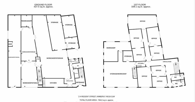 The first floor comprises a workshop area, cellular offices, and staff facilities.