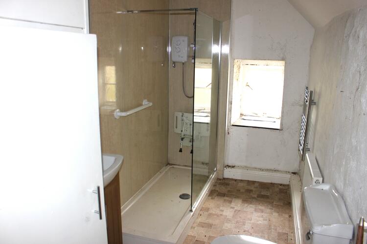 Having walk-in shower enclosure with electric shower unit NOT TESTED, wash hand basin in vanity unit with cupboards under, and low-level WC, together with heated chrome towel rail, central heating radiator, and built-in airing cupboard housing the hot water cylinder.
