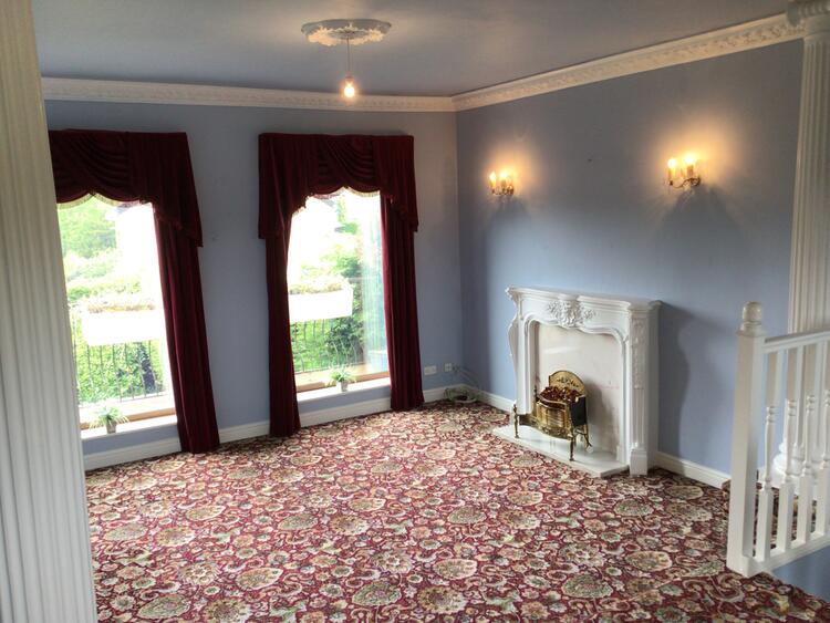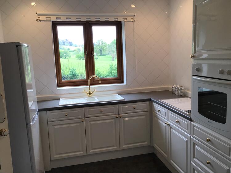 A generous open plan living/dining room with full length feature windows and doors opening onto a rear balcony overlooking the garden and enjoying far reaching views. A fitted kitchen with a range of fitted units and appliances.