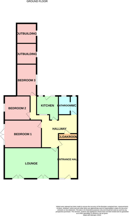 The property comprises of a private entrance, entrance hall, a large living room with two sets of French doors, a good sized kitchen, four piece family bathroom, three double bedrooms with the main bedroom having French doors to outside. Also located in the hallway is a large storage cupboard. Outside to the rear is a private yard with rear access steps and two outbuildings which have had previous planning permission for an additional bedroom and a bathroom as well as four storage rooms.