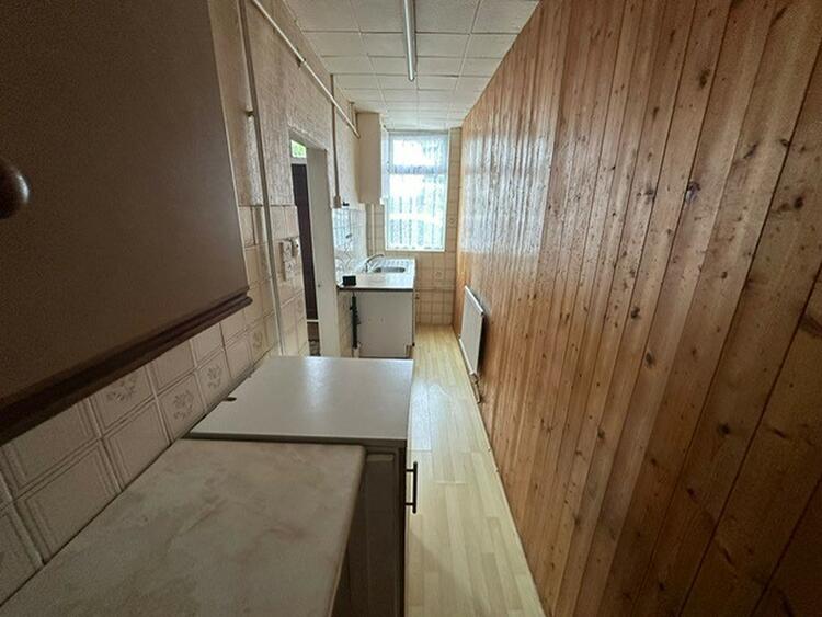 With basic units, sink and worktops, radiator and window to front.