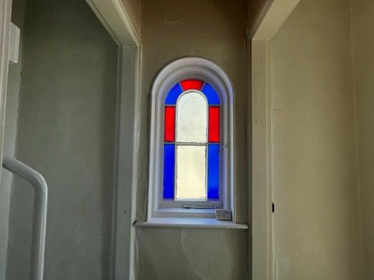 With stained glass, arched window.