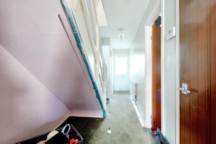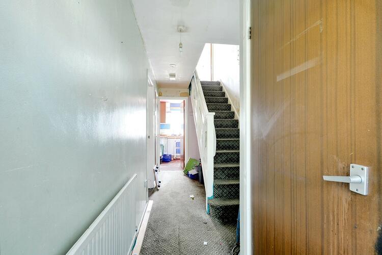 UPVC double glazed front door, carpeted flooring, radiator, textured ceiling, ceiling light.