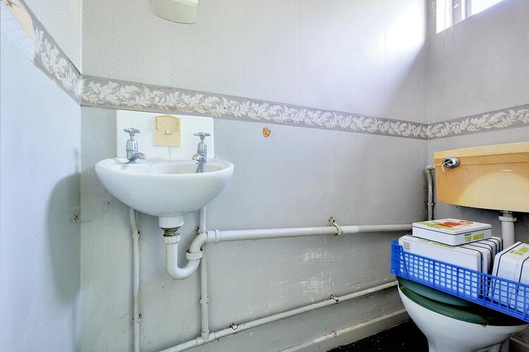 UPVC double glazed patterned window overlooking the front, low flush w.c., wall mounted sink, ceiling light.