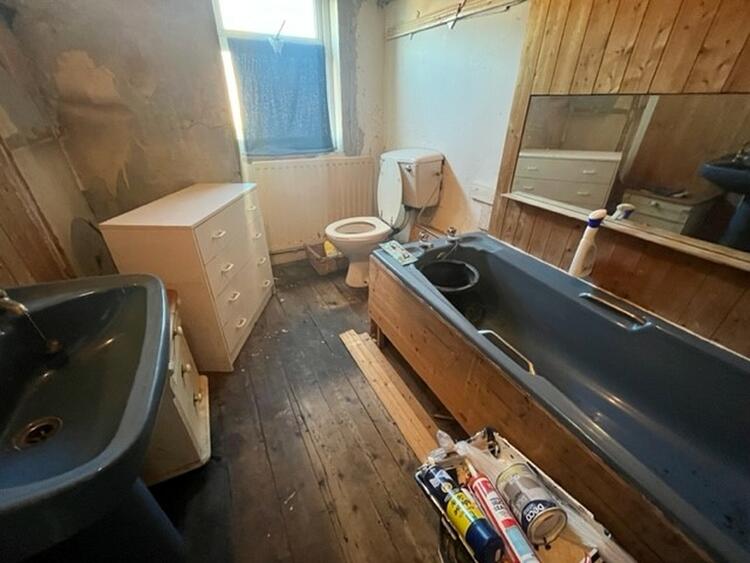Having low flush wc, wash hand basin and panel bath. Radiator and window to rear.