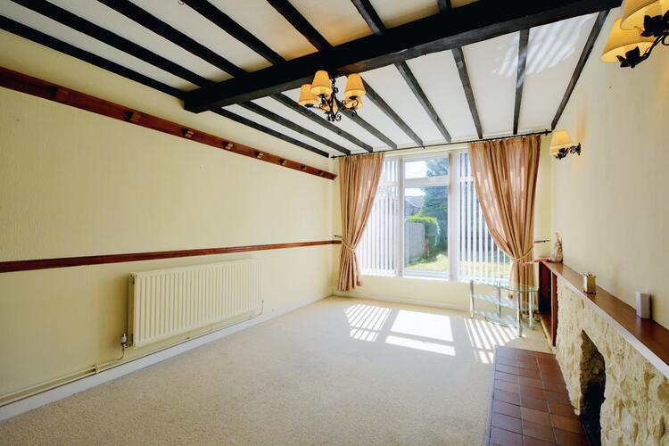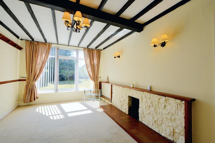 uPVC double glazed windows overlooking the rear, carpeted flooring, feature fireplace, gas fire, beamed ceiling, wall lights, radiator, textured ceiling and ceiling light.