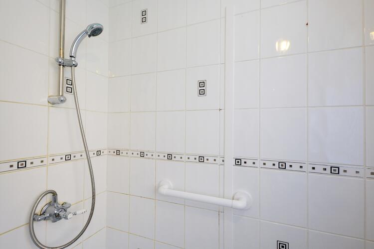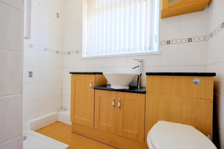 uPVC double glazed patterned window overlooking the side, laminate flooring, heated towel rail, WC, top mounted sink, walk-in shower, painted plaster ceiling and ceiling light.
