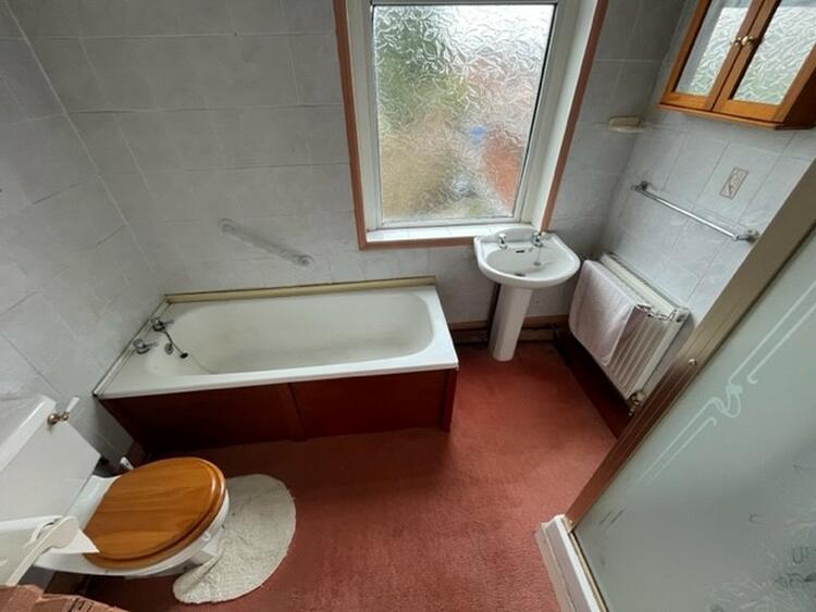 With low flush w.c. wash hand basin, panel bath and separate shower cubicle. Window to rear.