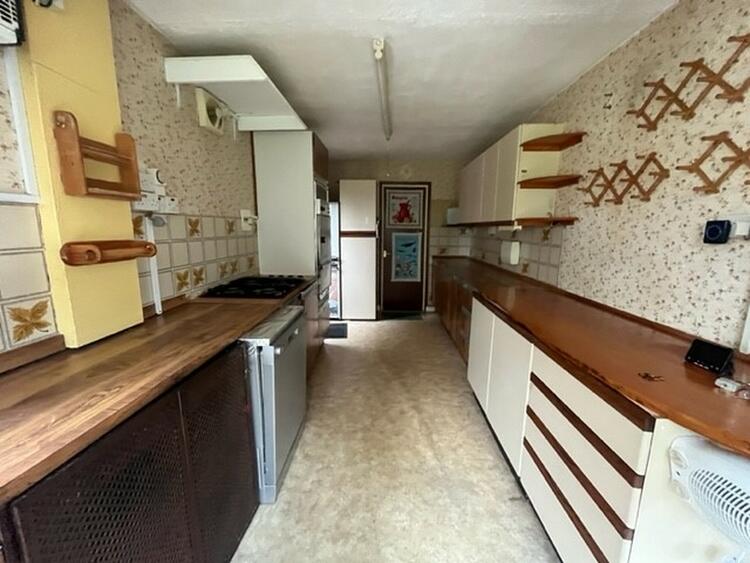 With a range of units, oven and hob, work surfaces, sink, space for appliances. Windows to side and rear aspects and door to side.