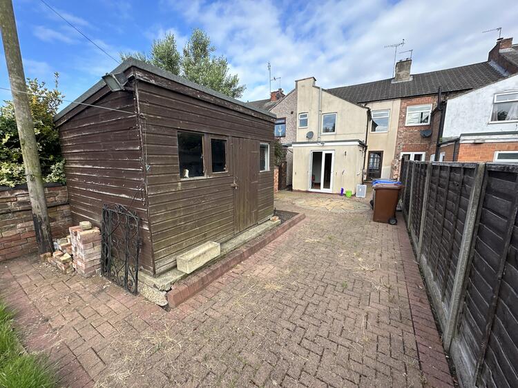 Small walled garden to front. Side shered access. Enclosed rear garden with block paved patio, lawns, timber shed and further timber store/ workshop.