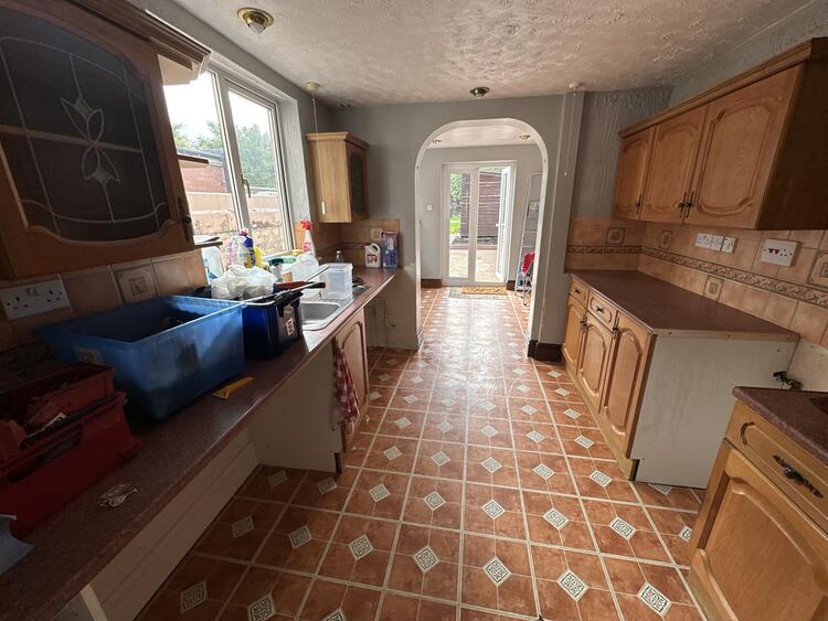 With a range of base and wall units, sink inset into worktops, space for appliances, window to side aspect and open to -