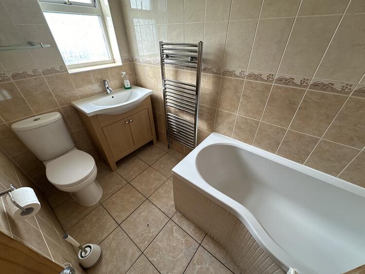 Having white suite comprising low flush w.c. wash hand basin and panel bath with shower over. Tiled walls and floor, heated towel rail and window to rear.