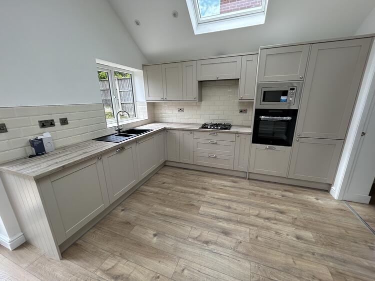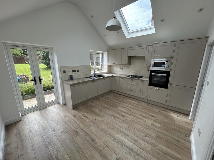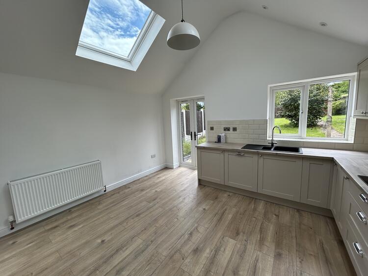 Extended and upgraded with sky lights and patio doors to rear garden. Built in is a fridge/freezer, dishwasher, hob, oven, microwave and sink with mixer tap. Plenty of worktop space and room for a dining table.