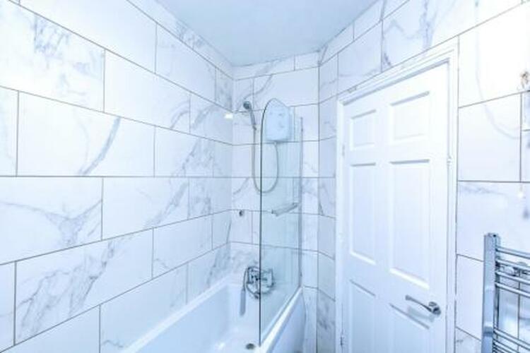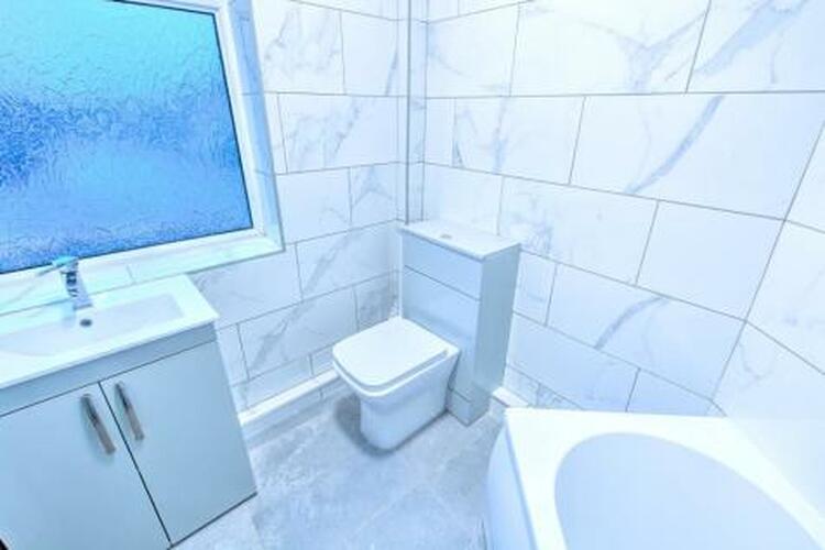 uPVC double glazed window to the front elevation, vanity wash hand basin with storage cupboards below, low level flush WC, panel bath with mains shower over and additional electric Triton shower above.