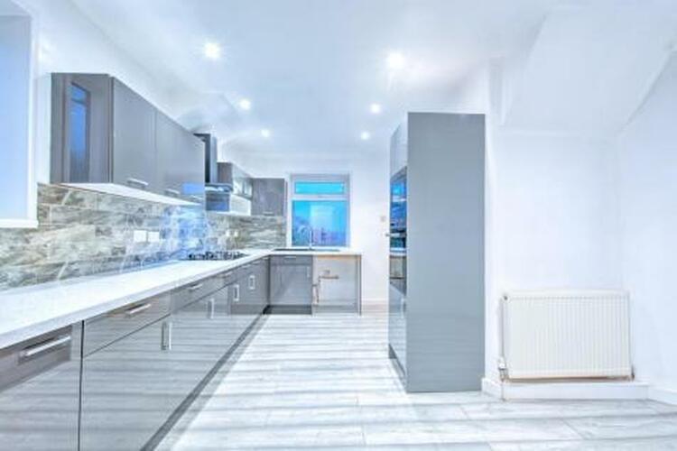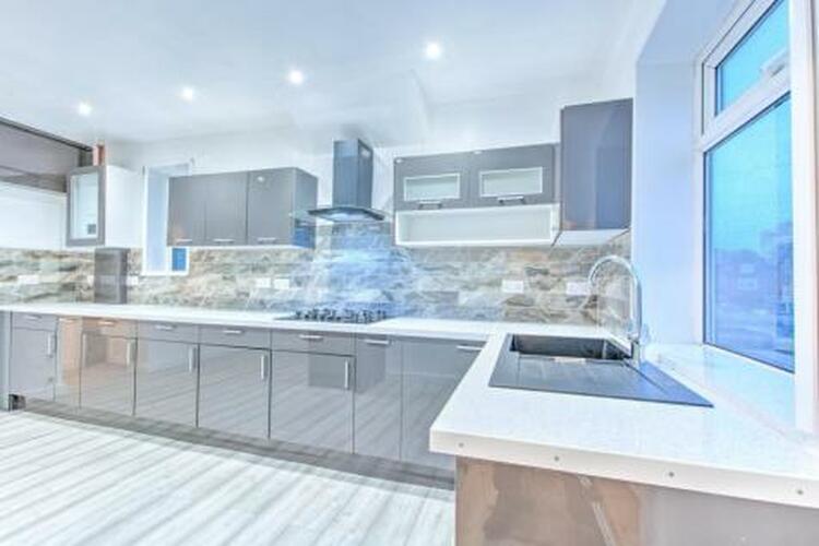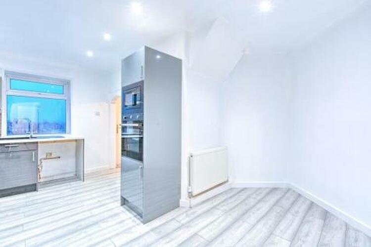 uPVC double glazed windows to front and side elevation, re-fitted wall and base units incorporating laminate work surface, five ring gas hob with stainless steel and glass extractor hood over, inset sink with swan-neck mixer tap above, space and plumbing for automatic washing machine, integrate eye level oven and microwave, wall mounted radiator, laminate floor covering, wall mounted gas central heating boiler, wall mounted electrical consumer unit, recessed spotlights to the ceiling, ample space for dining table, space and plumbing for freestanding fridge/freezer, doorway leading through to rear lobby.