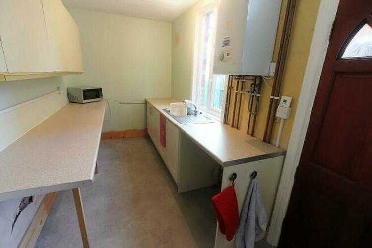 Comprising base and wall mounted units with work surfaces, sink unit with drainer, tiled splash backs, wall mounted boiler, plumbing for washing machine, window to the side elevation and door to the rear garden.