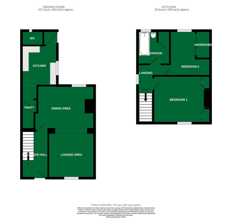On the first floor are two bedrooms and a bathroom with a bath and wash hand basin.